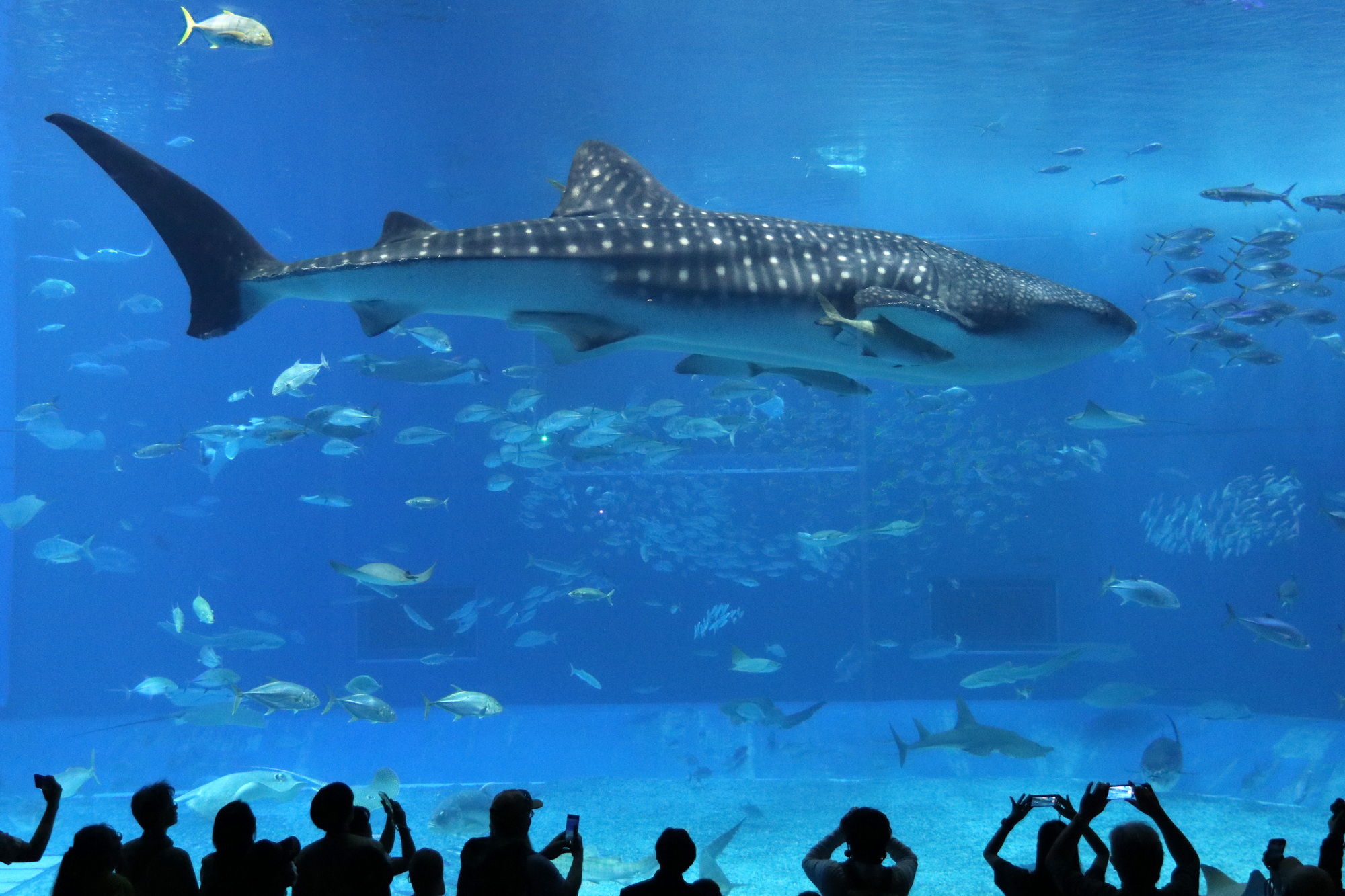 Das Churaumi Aquarium von Okinawa in Japan liegt idyllisch im Ocean Expo Park. Das Hauptbecken fasst 7,5 Mio. Liter Wasser und beherbergt neben zahlreichen anderen Fischen auch einen Walhai. Walhaie sind die größten Fische überhaupt und wachsen jährlich einen halben Meter. Dieses Exemplar ist ca. 9 m lang. Die Glasscheibe misst 22x8,2 m bei einer Dicke von 60 cm und ist erdbebensicher.