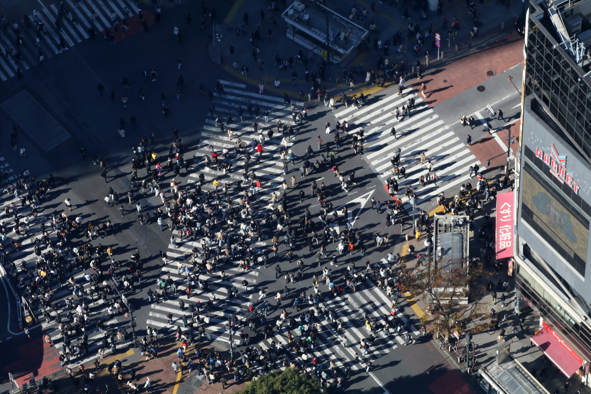 Die ‚Scramble Crossing‘ in Shibuya, einem Stadtteil von Tokyo, gilt als die belebteste Fußgänger-kreuzung weltweit. Bis zu 2.500 Menschen überqueren hier pro Ampelphase die Straße. Sie befindet sich direkt am Hachiko Square, einem Ausgang der Shibuya Station. Das Foto wurde von der Aussichtsplattform des Shibuya Sky Wolkenkratzers in 230 m Höhe aufgenommen.