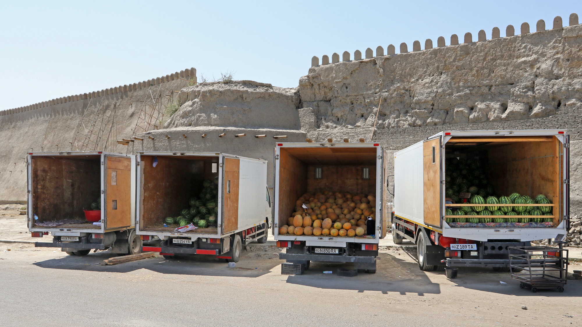 Im Juni ist die Zeit der Melonenernte in Usbekistan. Fährt man von Samarkand nach Chiwa, sieht man überall am Straßenrand Verkäufer, die ihre Ware anbieten. Diese LKWs stehen auf einem Markt in der Oasenstadt Chiwa. Im Hintergrund sieht man Teile der äußeren Stadtmauer.